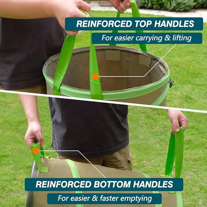 - EASY STORAGE & CARRYING -- we know you already have too many tools and gadgets, but fear not. The garden waste yard bags can fold down pretty flat, doesn’t take up a lot of space. Just store it in your garage or agility shed. Or throw into car trunk for camping. There are 2 long reinforced top handles, which let you lift or carry it around easily. 1 reinforced bottom handle makes emptying easier.