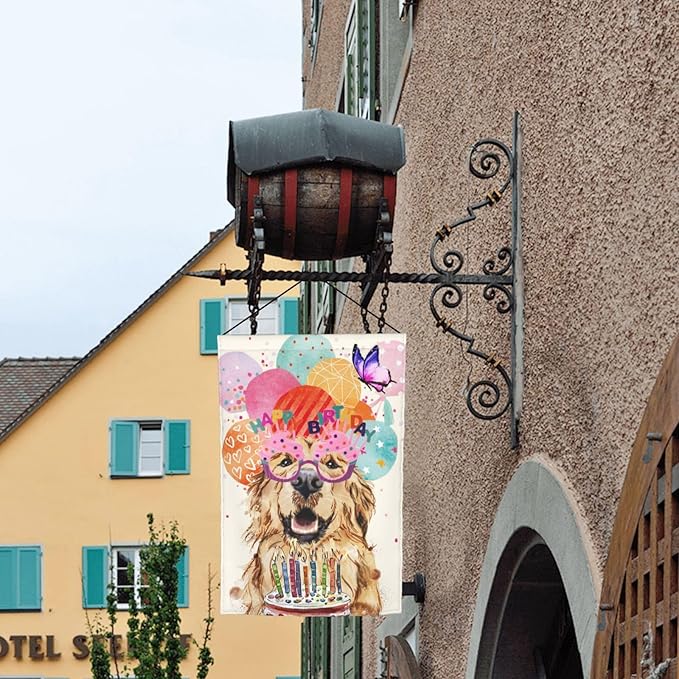 Happy Birthday Cake Balloon Ribbon Golden Dog Retriever Garden Flag Welcome Party Outdoor Outside Decorations Picks Home House Garden Yard Decor 12x18 Inch
