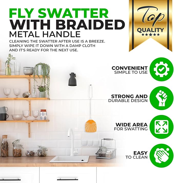 - High-Quality Fly Swatter: Our Fly Swatter is built to last. The sturdy metal wire ensures longevity and can withstand repeated use.: The Supreme Bug & Fly Swatter is designed for lightning-fast insect removal. Its precise design ensures you can strike down pesky bugs and flies in one swift motion.