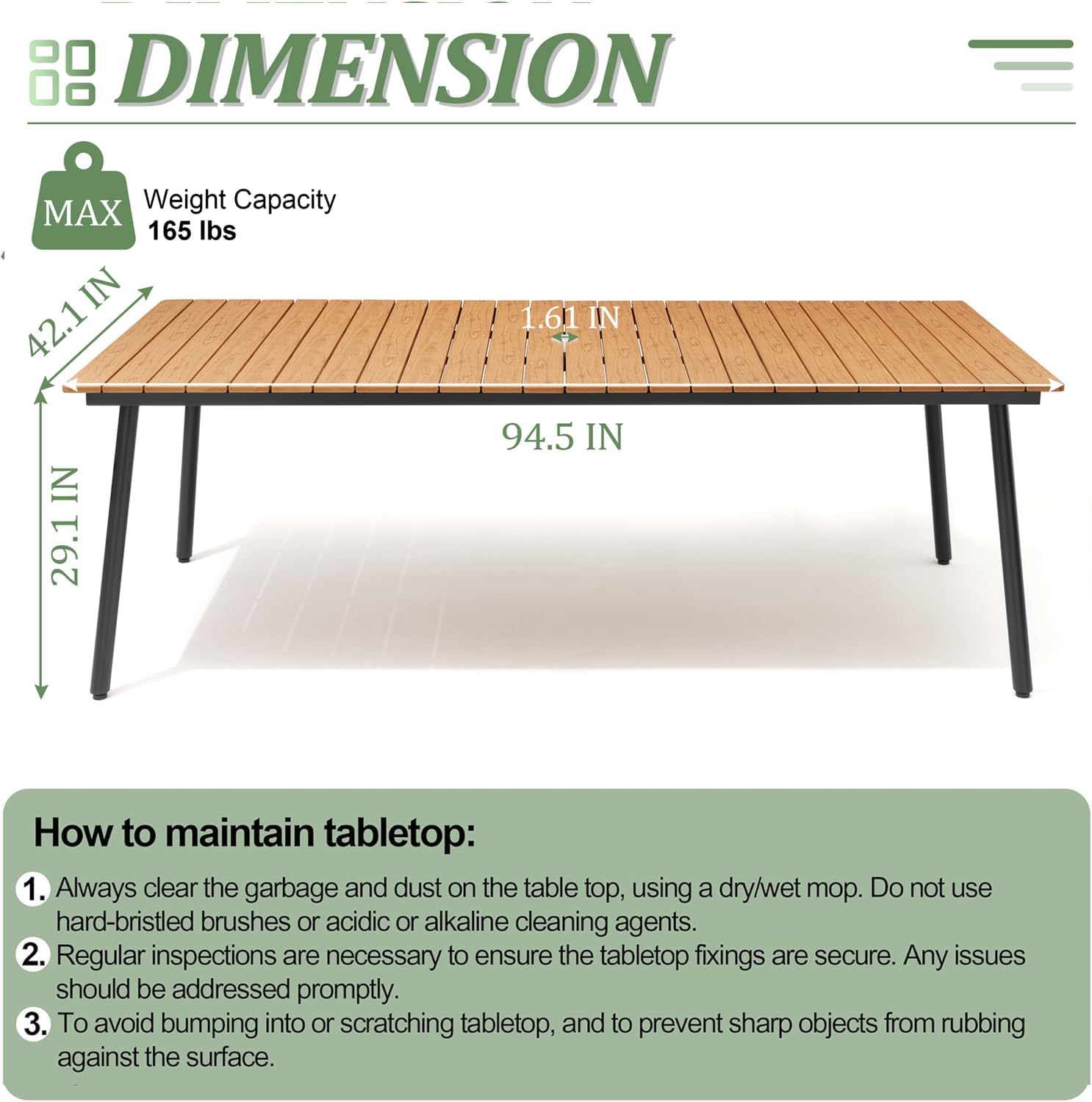 - TABLE Dimensions: This dining table is 29.1"H x 94.5"W x 42.1"D; Weight Capacity: 165lbs. Due to its lightweight design, this outdoor dining table can be easily moved to any location.