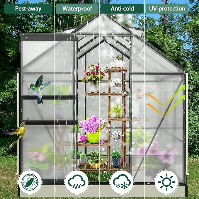 - PREMIUM MATERIAL: The outdoor hobby green house is made of a high quality aluminum frame and 4 mm twin-wall poly carbonate roof panels. The transparent panels help block UV rays but also allow maximum light transmission.