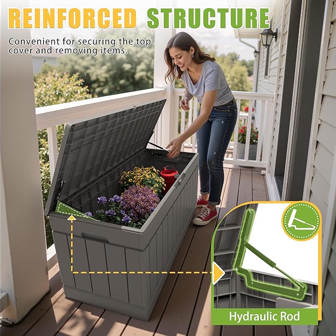 - Security design: Each deck box has lockable holes for added security. You can purchase the right lock for your needs; In addition, this box is equipped with hydraulic brackets to ensure your safety when opening and closing this box.