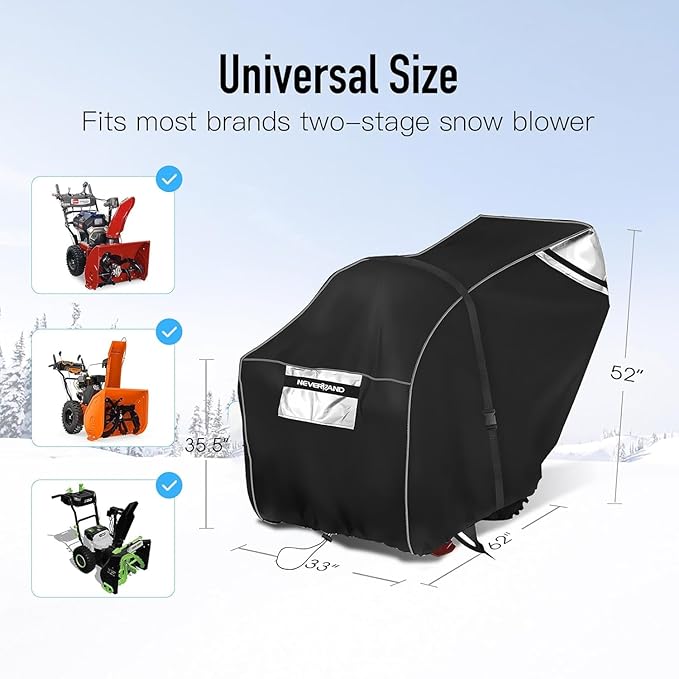 - 【Cover for Applicable Models】NEVERLAND snow blower cover size: 62''L x 33"W x 52" H1 x 35.5"H2. Fits most of Single-Stage/Two-stage snow throwers, compatible with EGO/Honda/Toro/Ariens/RYOBI/CRAFTSMAN/CUB CADET/PowerSmart/Briggs & Stratton/TROY-BILT/Greenworks//Simplicity/Yard Force/Husqvarna/homeya/yard works/bruwaa/Snow Joe and so on