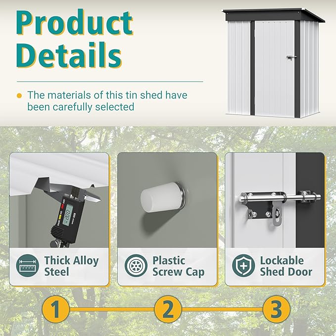 - Sturdy & Safe: The metal shed is made of galvanized steel with stronger tensile strength and hardness, and the structure of the shed is in accordance with the mechanics, which ensures the solidity and stability of the shed. In addition, we have optimized the safety of the shed. We provide plastic protection caps for each screw to prevent someone from being injured due to the exposed screws.