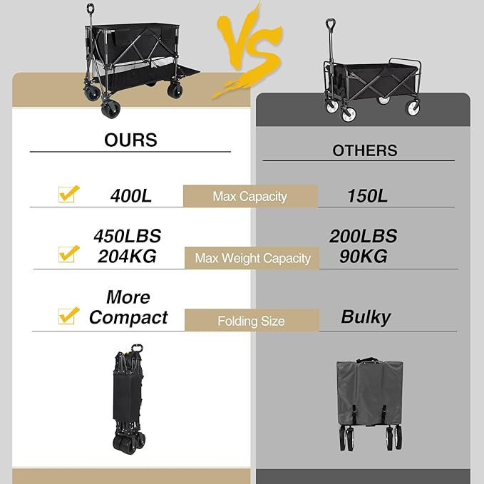 - Heavy-duty Structure: Made of 25x10mm steel pipes, our folding wagon cart support up to 450lbs. Durable fully-padded 600D Oxford fabric and polyester fabric, waterproof, tear-resistant, easy to clean. Open size is 53ββLx20ββWx35ββH (with extended shelf), with enough space to accommodate stuffs.