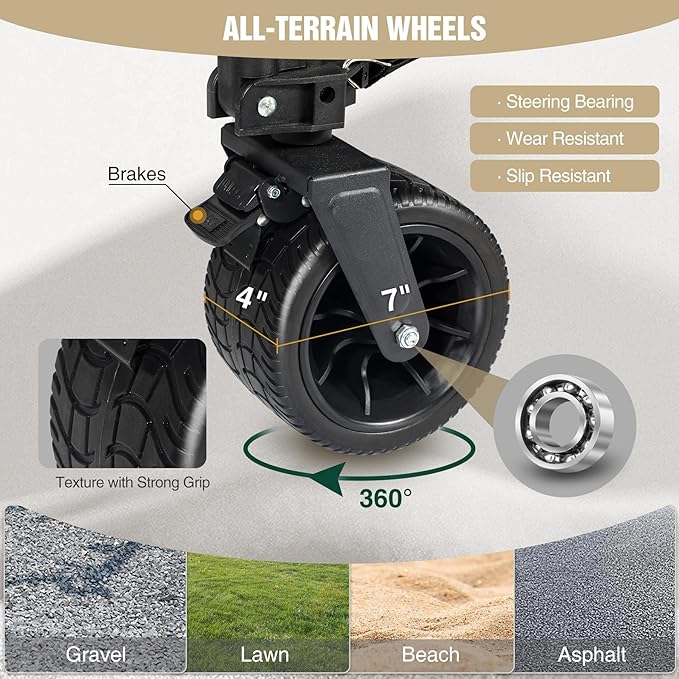 - All-Terrain Wheels: Collapsible beach wagon is equipped with 7" diameter PVC off-road wheels that can move smoothly in any terrain. Among them, the front wheels with brakes can rotate 360 Β°, making it easy to maneuver and safe to park.