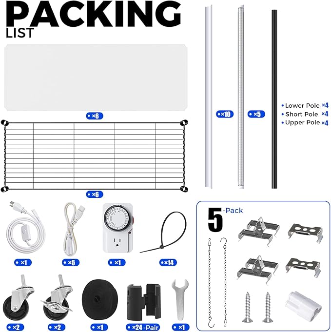 - Package: 5 X 35.4" Barrina grow lights for plant shelf, 5 X 39.4" connecting cables, 1 X 59" power cord with on/off, 1 X storage tape, 6 X wire racks, 4 X wheels, 6 X PP pads, 5 X T8 grow light accessory kits, 1 X plant stand accessory kit. Compatible with Barrina OS Series Cords