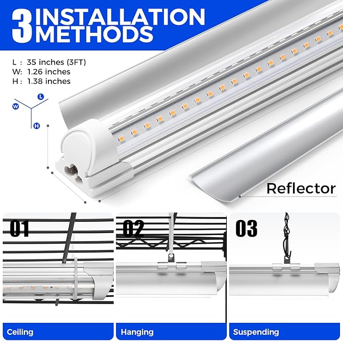 - Full Spectrum Grow Light: Including 5pcs 3FT 30W T8 LED yellow grow lights, each with a reflector to increase efficiency, promote plant growth and protect your eyes. Yellow light is more suitable for the growing and flowering period of plants, such as vegetables, fruit trees, leafy vegetables, flowers, indoor foliage plants