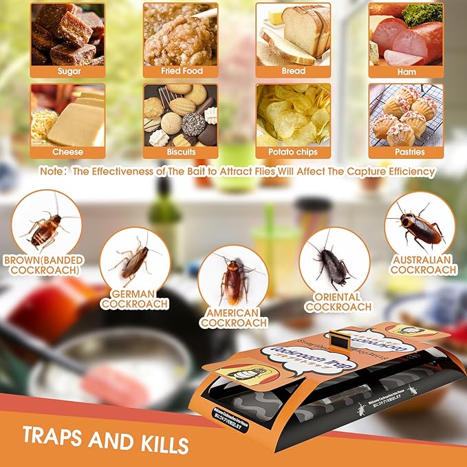 - Effective cockroach capture: Our sticky traps for cockroaches has complex multiple entrances are easy for cockroaches to enter from all directions, and we equip roach traps indoor sticky with 18 of our special effective roach baits, providing a comprehensive solution for catching various insects.