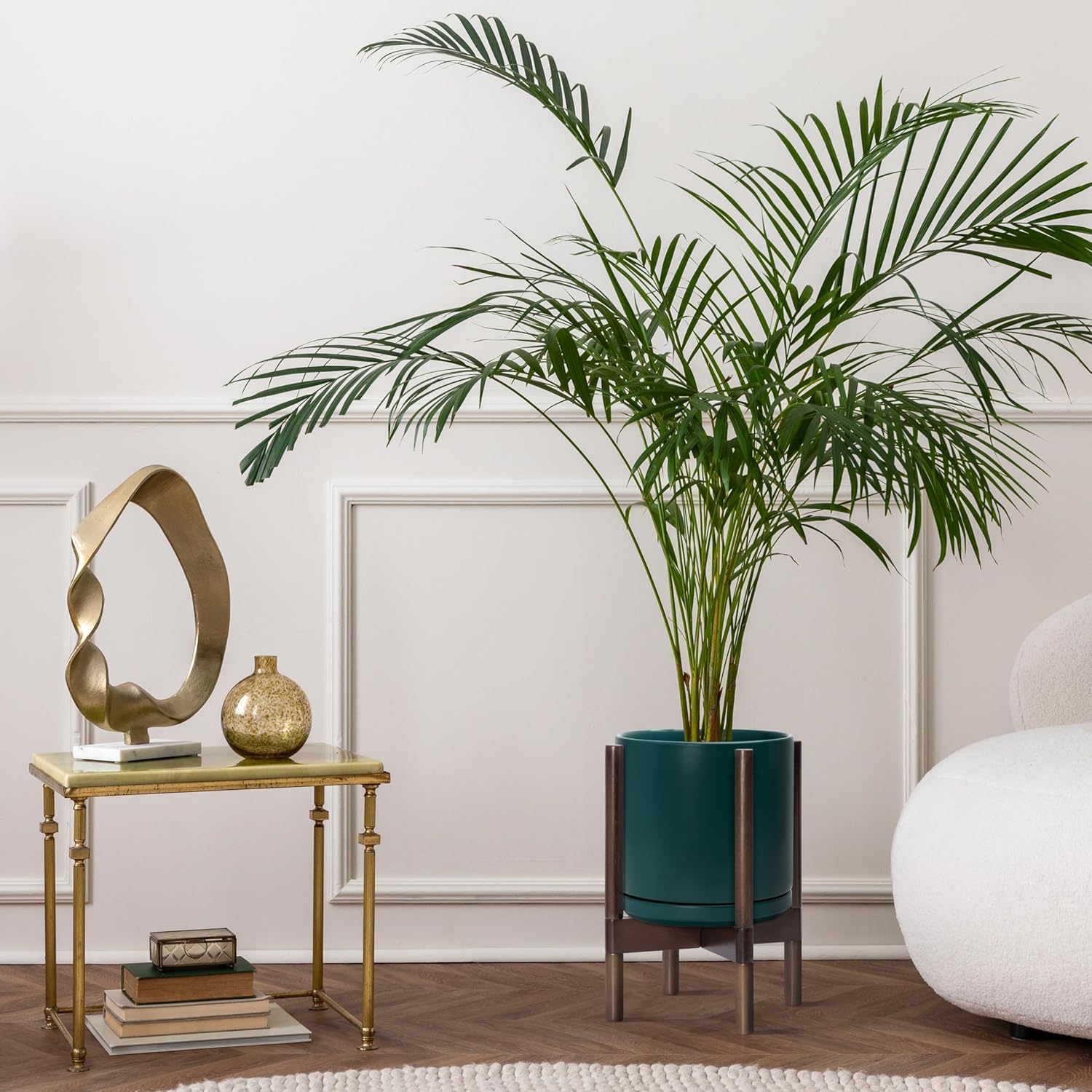 D'vine Dev Ceramic Planter with Walnut Color Stand - 10 Inch Modern Round Flower Pot with Wood Planter Holder, Teal, 55-B-X-4