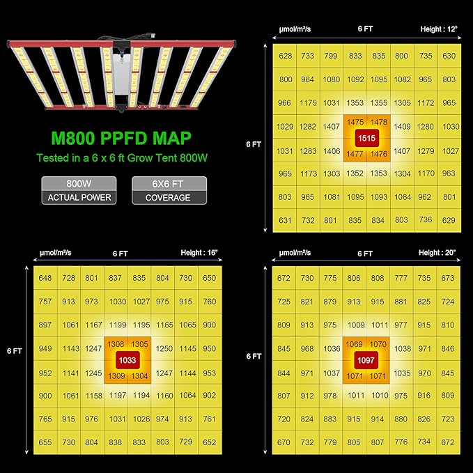 - MAXIMIZE YIELDS & CROP QUALITY - AGLEX M800 led plant growing light is with 2720PCS high efficient chips, only consumes 800w with 2720 leds, achieving higher average PPFD with 1515muol/㎡/s at 6x6ft core coverage. The average yield is more than 2.8g per wattage. The 800w led bar grow light can help you achieve maximum quality and quantity. Wide Input Voltage 100-277V, can meet most input voltage.