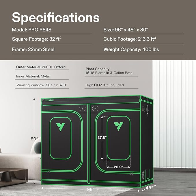 VIVOSUN P848 96"×48"×80" PRO Grow Tent, with Thick 1 inch Poles, Strengthened High Reflective Mylar Oxford Fabric, Extra Hanging Bars & High CFM Kit for Hydroponics Indoor Plant for AeroLight A200SE×4