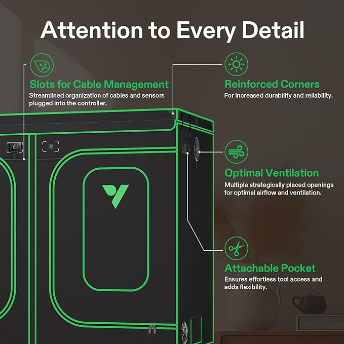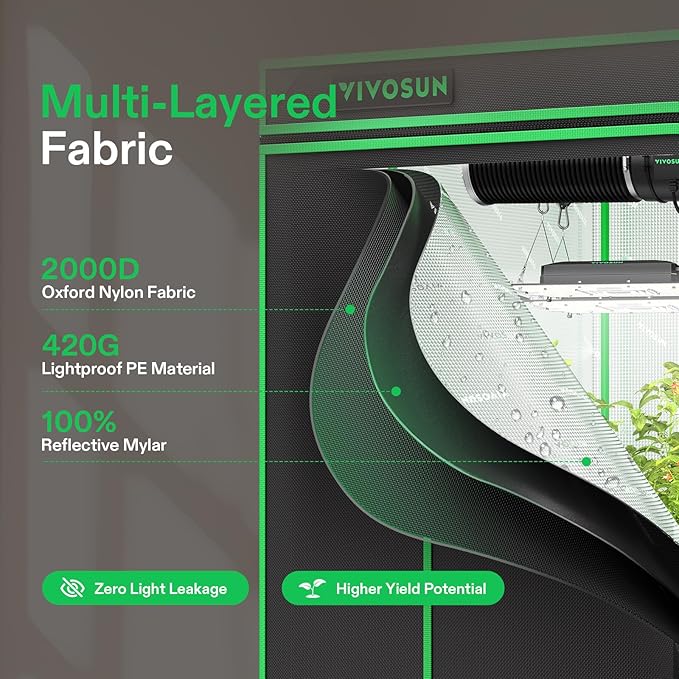 - Upgraded Lightproof Fabric: Durable 2000D Oxford canvas lined with plant-friendly PE and 100%-reflective Mylar; The three-layer thick fabric ensures zero light leaks, boosting the output efficiency of your setup; Zipper section is designed with black inner lining for enhanced light prevention