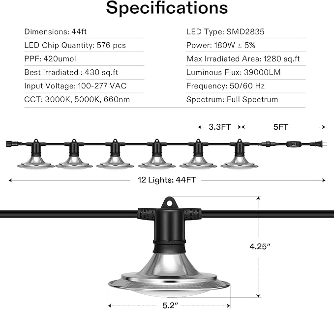 - Durable & Waterproof: Built with quality waterproof materials and boasting IP44 waterproof rating; these lights are suitable for both indoor and outdoor applications; Their low heat output and strong heat dissipation efficiency make it safer to your plants and more durable (Please firmly secure the light to the socket and protect unused sockets to ensure waterproofing)