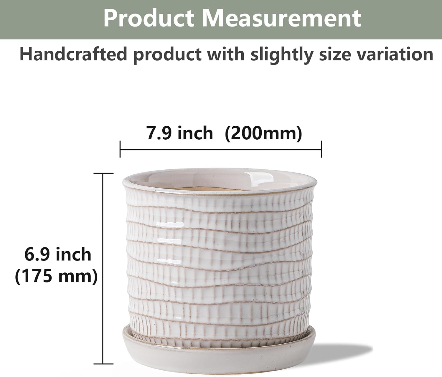 8 Inch Plant Pot: Ceramic Planter with Drainage Hole & Saucer - Cream White Flowerpot for Indoor & Outdoor Plants - with Separate Tray for Home & Office - Wave Embossed Design