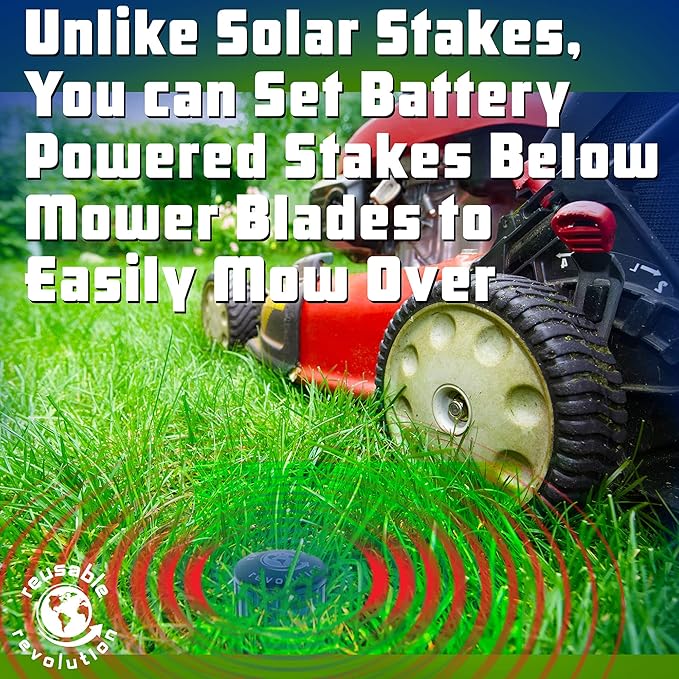 - Our low-profile Mow-Over design lets you install the stakes flush with the ground so you can mow over them for easy lawn care. This also eliminates tripping hazards and unsightly solar panels sticking up in your yard. The stakes emit a 360-degree sonic frequency every 25-35 seconds.