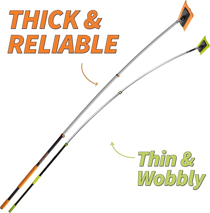 - THE ONE EXTENSION POLE THAT WON’T BREAK- Made of meticulously crafted, extra-thick aluminum, this extension pole is stiffer, tougher, and stronger. While other telescoping roof snow removal tools can get wobbly and fragile when fully extended, the EXTEND-A-REACH telescopic pole will always perform solidly. The snow rake's pole also features quick-release thumb lever clasps for easy extension control and non-slip hand grips to ensure maximal stability and reliable grip.