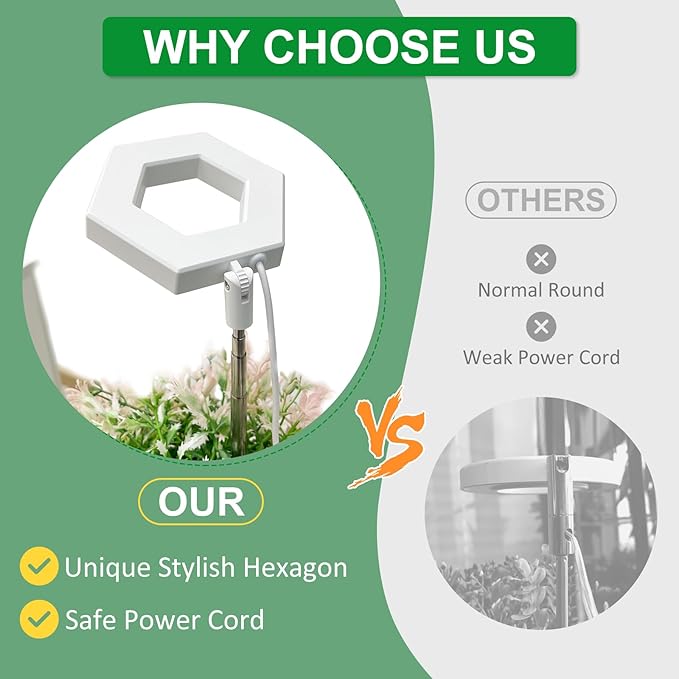 - 【Unique Modern Design】: This grow light serves as a powerful tool for plant cultivation and, at the same time, doubles as a stylish decoration for any home space. The modern hexagonal shape of our plant grow light adds a touch of elegance to any indoor space, and its versatile and convenient switch will make your indoor gardening easier!