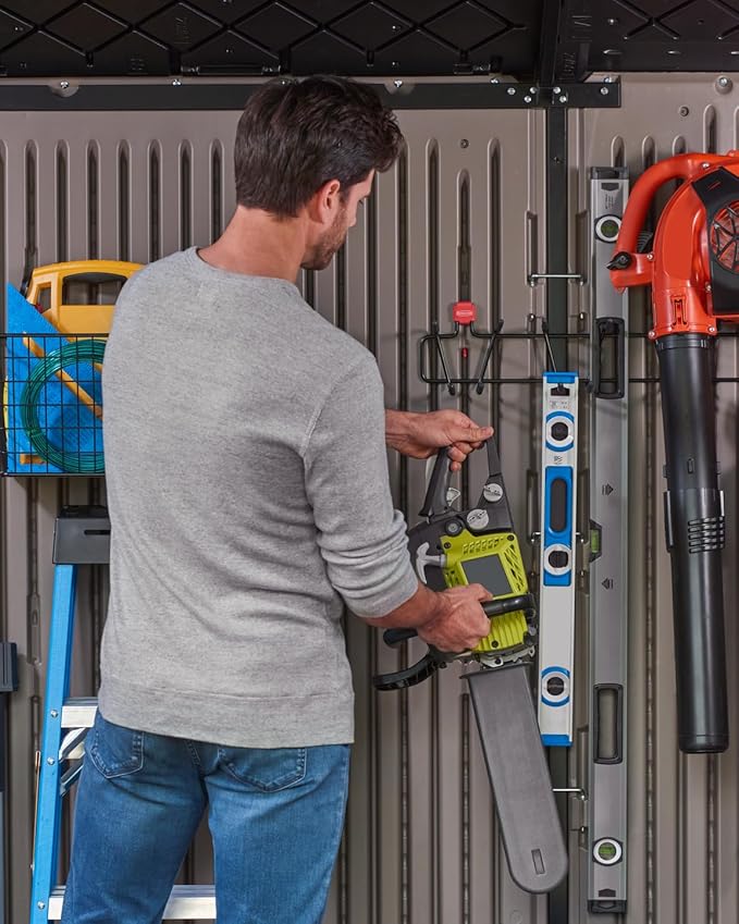 - CUSTOMIZE TO YOUR NEEDS: Use Rubbermaid wall anchors to add pegboard, shelves, utility hooks, sports racks, and other accessories to the inside of the shed. Each wall panel is strong enough to hold up to 75 lbs, using Rubbermaid shed accessories.