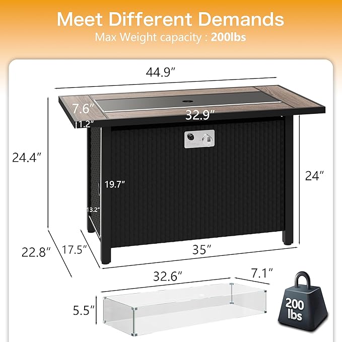 Meilocar 45in Fire Table, Propane Fire Pit with Glass Wind Guard and Rain Cover, Outdoor Firepit Table 50000 BTU 3-in-1 Fire Table for Patio/Yard/Balcony, Walnut Tabletop