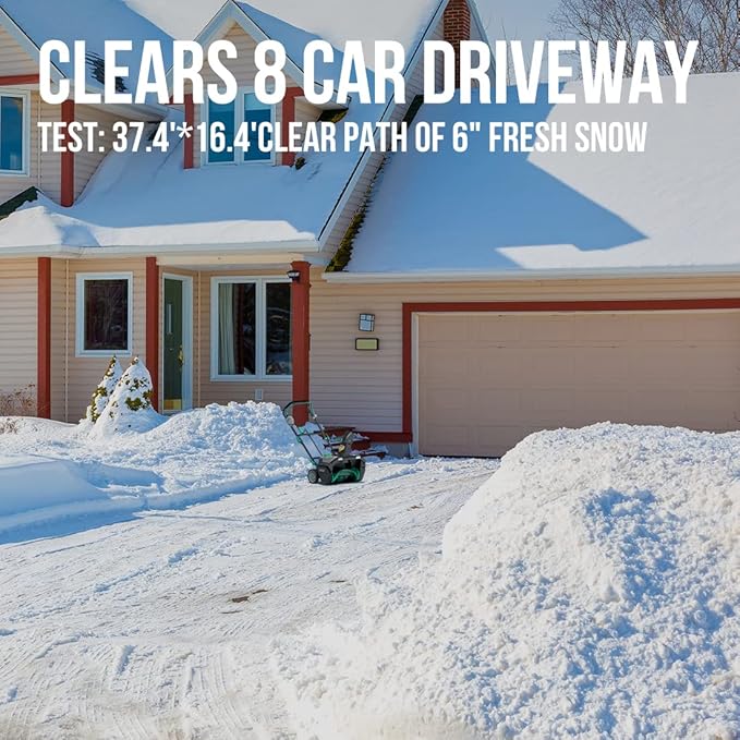 - 【High-Efficiency Brushless Motor】This battery powered snow blower tackles snow of 6 inches to 12 inches and throw snow up to 25 feet far.