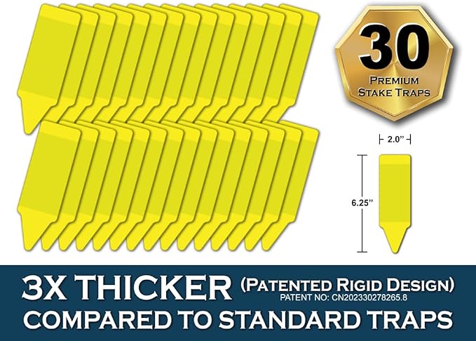- β QUALITY DESIGN: While fun shapes may appear charming for gardening accessories, they can potentially disturb your plants or prove challenging to position. Our simple, garden-themed patented stake shape enables easy insertion into any potted plant or hassle-free hanging on trees. Furthermore, our dual-sided glue stake boasts three times the thickness of other standard traps.