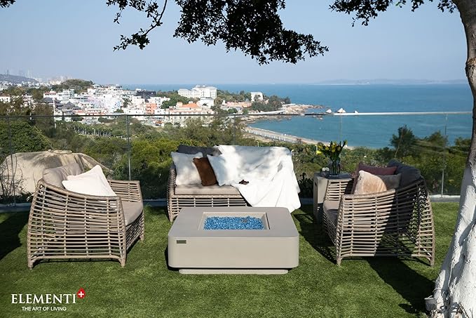 Elementi+ | Lucerne Gas Fire Pit Cast Concrete 42" Square Fire Table, Outdoor Fire Pit Electronic Ignition | Canvas Cover, Fire Glass and Burner Lid Included | Light Gray | Propane Gas