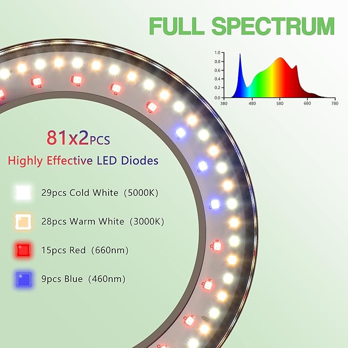 - 162 LEDs Full Spectrum: Equipped with high-efficiency 162 LEDs, including 29x2 cold white(5000K)+28x2 warm white(3000K)+18x2 red (660nm)+9x2 blue(460nm) LEDs, the grow light emits full spectrum from 380nm to 800nm, which is infinite close to natural light, just like sunlight in your living room