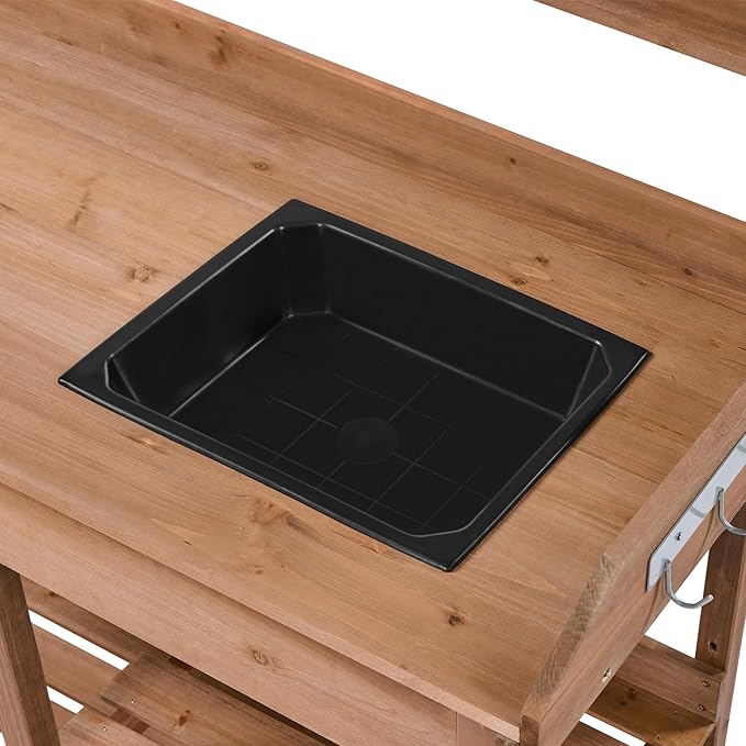 - PRACTICAL & CONVENIENT DESIGNS FOR HORTICULTURE: This waist-height garden potting bench embraces a working and storage area for horticulture. The spacious console features a removable plastic sink, and the storage area comprises a drawer, a 2-layer shelf, an elevated top shelf, and 3 side hooks for ease of use