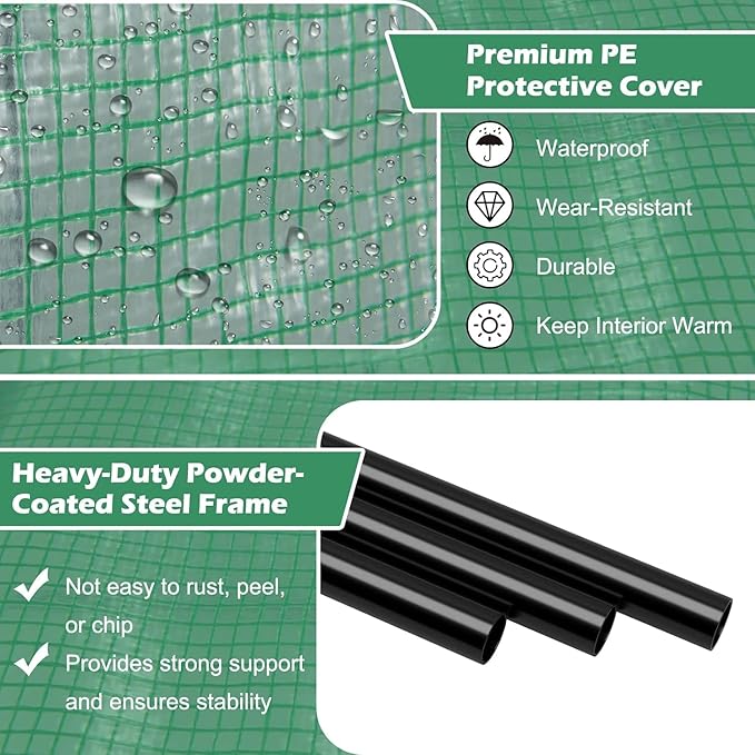 - 【Weather-Resistant & Durable PE Cover】Our small greenhouse features a robust protective cover crafted from high-quality PE material that is tear-resistant and waterproof. This durable covering effectively shields your plants from the effects of outdoor inclement weather, and even animal damage. Additionally, it helps retain heat within the greenhouse, creating an optimal environment for your plants.