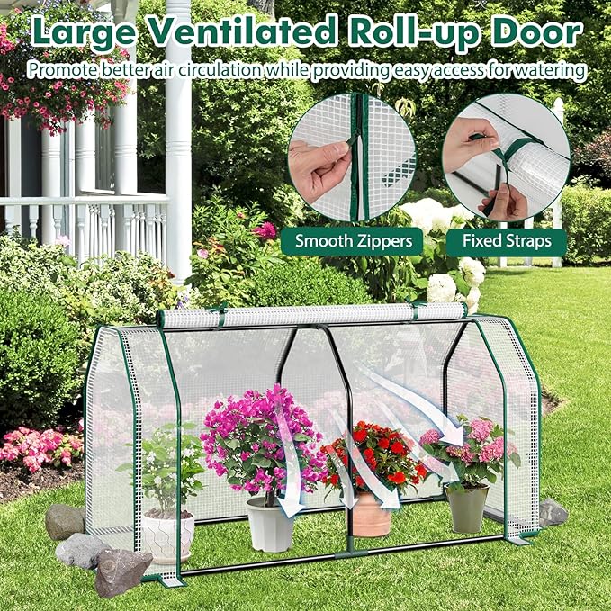 - 【Enhanced Airflow】The mini greenhouse features a spacious roll-up zipper door, ensuring excellent air circulation. This design allows easy accessibility for watering, fertilizing, and effectively prevents plant damage caused by extreme temperatures, whether scorching heat or freezing cold. It effectively fosters a favorable growth environment for your plants.