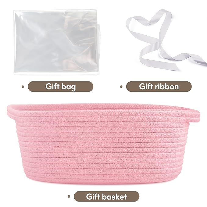 Pro Goleem Small Woven Basket with Gift Bags and Ribbons Durable Baskets for Gifts Empty Small Rope Basket for Storage 12"X 8" X 5" Baby Toy Basket with Handles, Pink