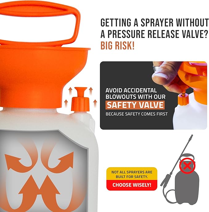 - Built-in Pressure Release Valve for Safe Operation - Prevent accidental spray bursts with a safety valve that releases excess air pressure. Built with heavy-duty components, our sprayers in lawn and garden offers consistent and leak-free operation when correctly assembled and maintained.