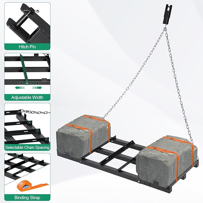 - Unique design: 4 FT working width efficiently covers a wide path and the adjustable-width bars accommodate 13in x 19.7in concrete blocks weighing up to 50 Pounds for added leverage and depth; Our drag harrow comes with 4 FT chain that prevents the connection damage, makes it easier to turn, allowing you to adjust the traction as you need it