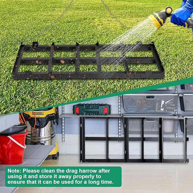 - Heavy-duty and Durable: This 4 FT driveway grader features sturdy, heavy-duty steel construction for durability and resistance to breakage; 4 FT chain adjusts for secure traction as needed; Black powder coating ensures long life and lasting good appearance(Note: Please clean the drag harrow after using it and store it away properly to ensure that it can be used for a long time)