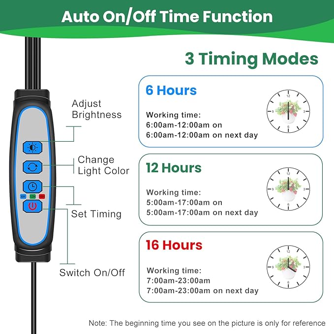 - [6 12 16H Timer] Most of the plant lights with built-in controllers on the market do not exceed the timed 12H, and ours has been upgraded to exceed 12H, which is more friendly to light-loving plants, so that the plants grow better. Set the timing time(6H 12H 16H), you don’t need to manually turn on and off the grow light. The grow light will convenient to takes good care of your plants when you go out to work or on vacation