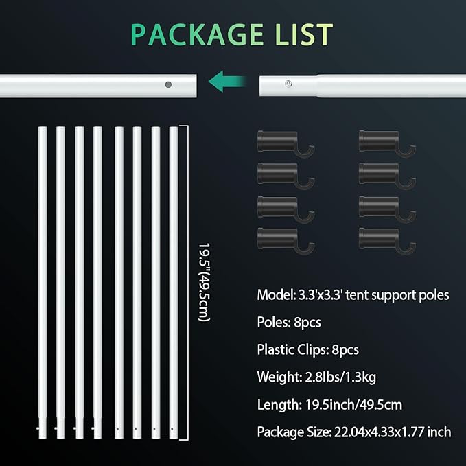 - TENT ACCESSORY POLES: Specially designed for MARS HYDRO grow tents.You will receive 8 tent poles measuring 19.5"(49.5cm) in length and 8 hooks.After the tent poles and hooks are paired and assembled, one set of 4 complete tent side poles will be obtained.with a quantity sufficient to meet your needs and replacement.