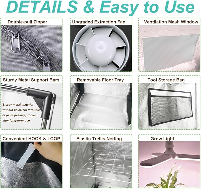- ★【Easy Installation & Maintenance】Assembly instructions and all hardware are included for quick and easy installation;Easy to clean;Grow tent kit helps you optimize temperature, humidity, light, and ventilation, so you can get a larger yield than you could get with outdoor growing.