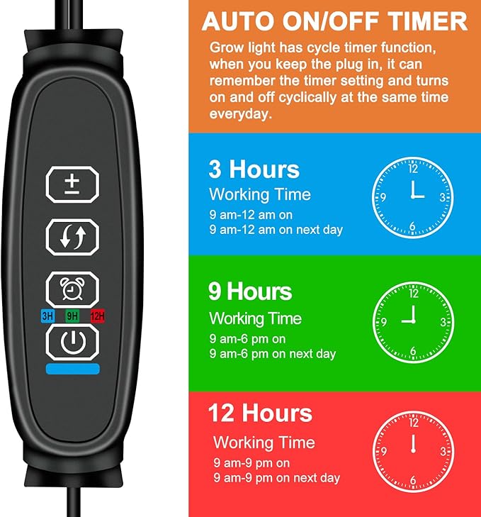 - Timer and Dimmer Function:This indoor seedling light offer the circular memory timer function with 3 options-3/9/12H. When keeping power, it can automatically turn on and off every day according to your settings.γ You Could Operate One of Them Separately and Support 10 Levels of Dimming.γ