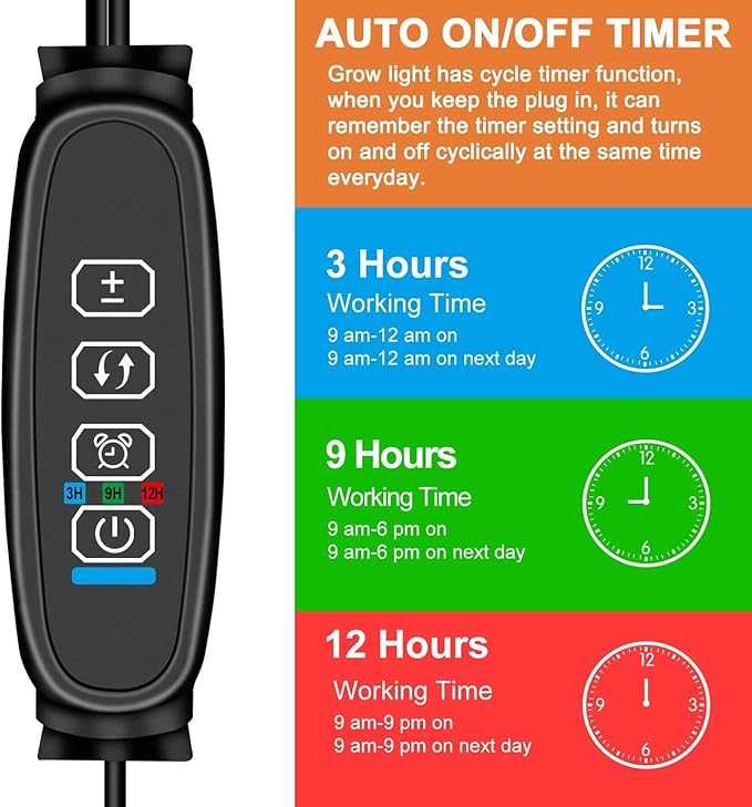 - Timing and Dimming Function:This indoor seedling light offer the circular memory timer function with 3 options-3/9/12H. When keeping power on , it can automatically turn on and off every day according to your settings.γ You Could Operate One of Them Separately and Support 10 Levels of Dimming.γ