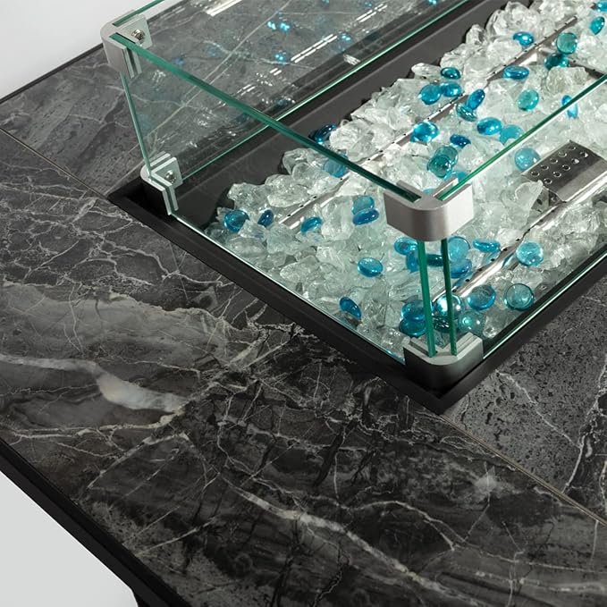 44in Outdoor Propane Gas Fire Pit Table, 50,000 BTU Auto-Ignition Gas Firepit with Glass Wind Guard, Marble Tile Tabletop, Mixed Color Glass Rocks, Brown PE Rattan