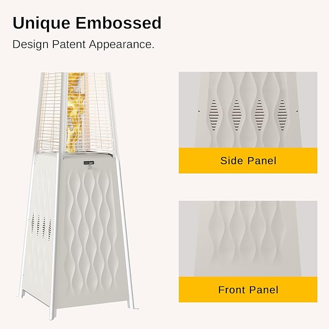 - ๐จ๐ป๐ถ๐พ๐๐ฒ ๐๐บ๐ฏ๐ผ๐๐๐ฒ๐ฑ ๐ฃ๐ฎ๐๐ฒ๐ป๐ ๐๐ฒ๐๐ถ๐ด๐ป : Our team poured a lot of heart and soul into the design of the EAST OAK Pyramid Patio Heater, and we're pleased to offer the design in four stainless steel surfaces embossed, a pyramid shape to create a beautiful and elegant outlook, burning flame helps you enjoy the outdoor living.
