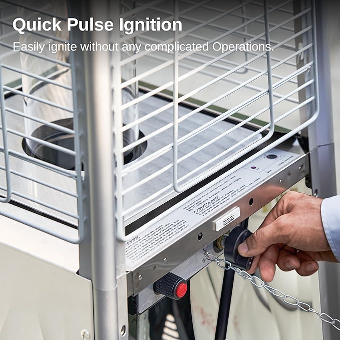 - ๐ข๐ป๐ฒ-๐๐๐๐๐ผ๐ป ๐๐ด๐ป๐ถ๐๐ถ๐ผ๐ป : Outdoor patio heaters are easy to start, and a one-button ignition system can ignite a flame in 5 seconds. The adjustable control knob can customize the heat or turn it off according to your preference from low to high. Note: 5AA battery included, recommended to remove the battery if not used for a long time.