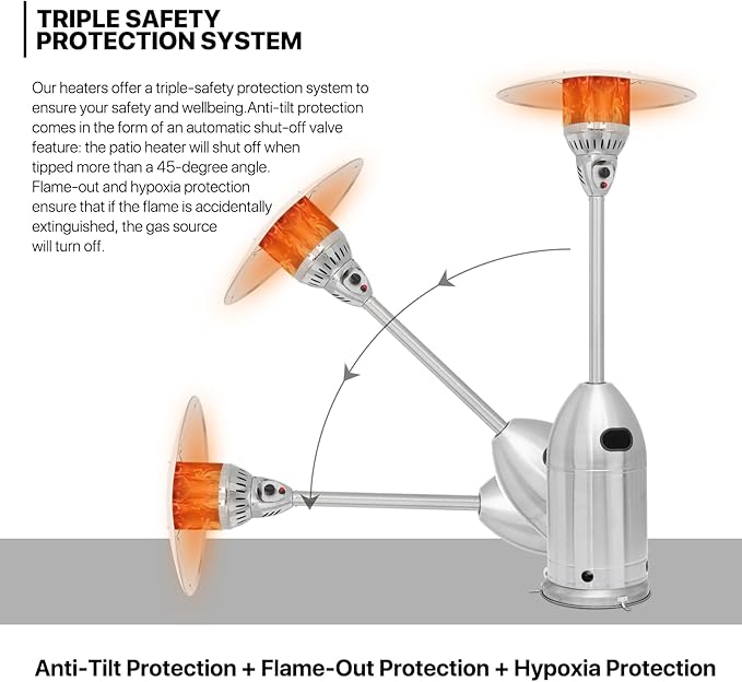 - Safety First - Prioritizing your safety, our patio heater is equipped with an anti-tilt safety device, ensuring an automatic shut-off if tilted beyond 45 degrees. The built-in weighted ring base also makes the heater not easy to tip over when in use.
