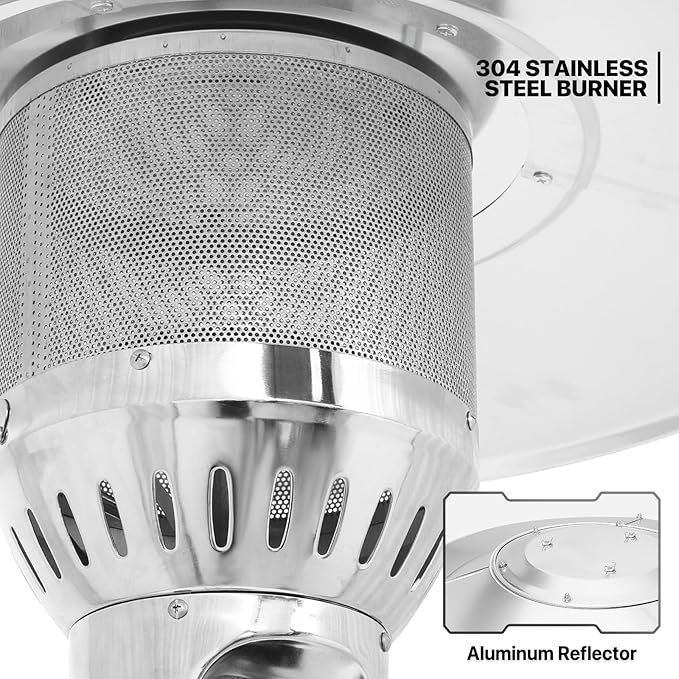 - Durable Stainless Steel Burner & Aluminum Reflector - The burner of the heater is made from stainless steel, which has higher heat resistance, corrosion resistance, rust resistance, and low-temperature resistance. Adopted chromium-plated iron protective net and all-in-one aluminum reflector makes these propane heaters outdoor sturdy, durable and anti-rust, ensuring long-lasting usage.