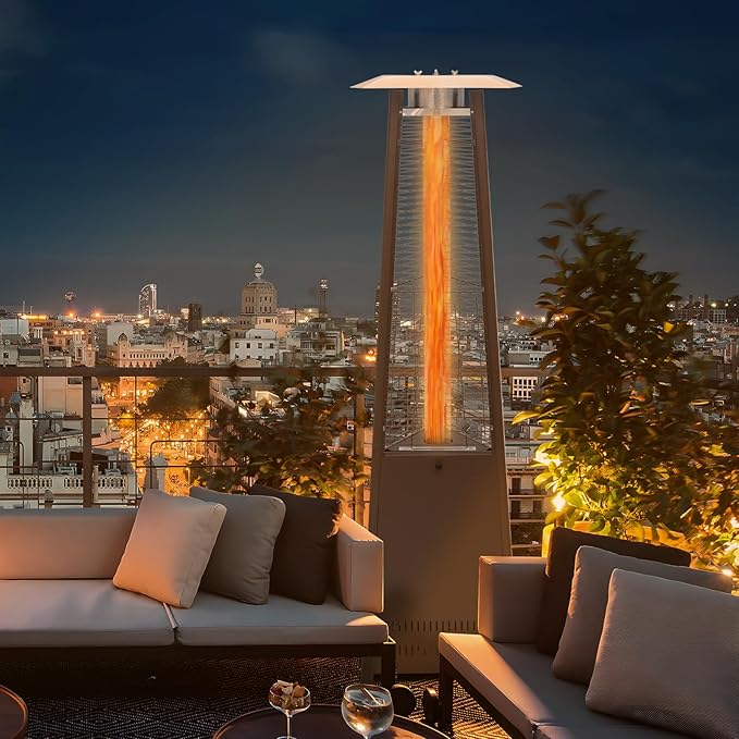 - Elegant Outdoor Ambiance - Elevate your outdoor setting with our patio heater that exudes style with its contemporary pyramid design. A clear glass tube showcases a mesmerizing dancing flame, not only providing warmth but also adding a touch of elegance and romance to your backyard, patio, deck, or garden.