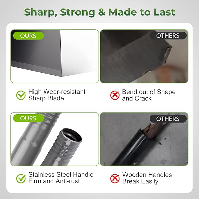 - Durable and Reliable: Constructed from high quality steel material, our shovel is engineered to withstand the challenges of harsh conditions without succumbing to rust or deformation in different environments. The blade crafted from saw blade steel and tempered through high-temperature quenching, is extra hard and incredibly effective at cutting through soil. It's perfect for various yard and construction tasks.