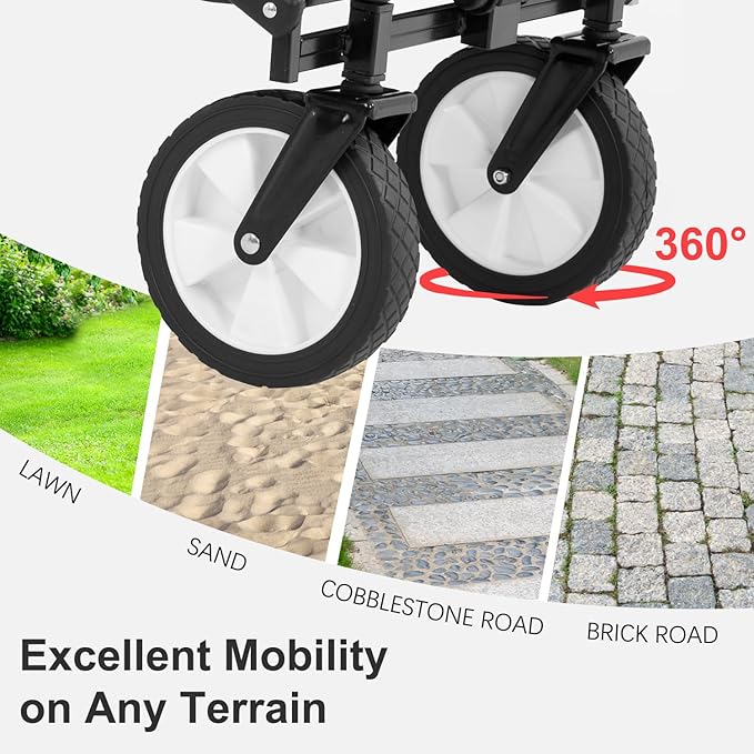 - 🌟360°Universal Wheels:This collapsible wagon utility cart equipped with four 6.5" diameter all-terrain wheels, including two front wheels that can rotate 360 degrees.Our folding collapsible wagon can roll on different ground, from cement to wood floor, from stone road to sand.