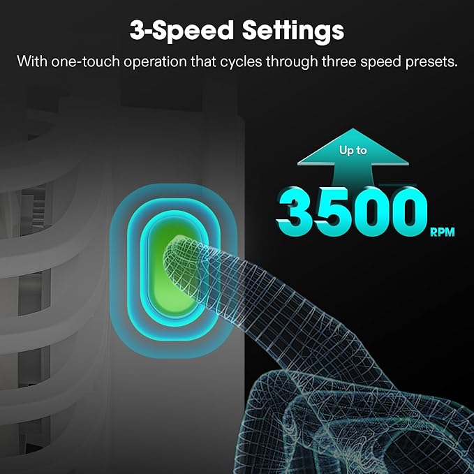 - 3-Speed Settings: With one-touch operation that cycles through three speed presets up to 3500 RPM, this compact fan offers tailored cooling customization; And with the integrated memory feature, your chosen fan speed is automatically retained if power gets disrupted