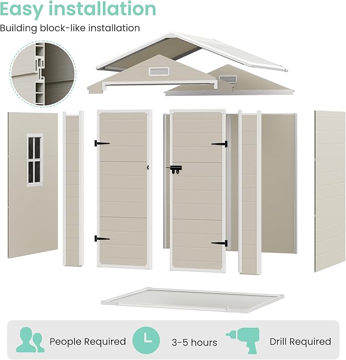 - EASY INSTALLATION:The building block-like installation method greatly reduces the installation difficulty as well as time. The screws are embedded to ensure beauty and safety. Our easy-to-follow instructions come with detailed illustrations, with clear numbering on all hardware and parts, the shed may need to be assembled with 2 persons in 3-5 hours